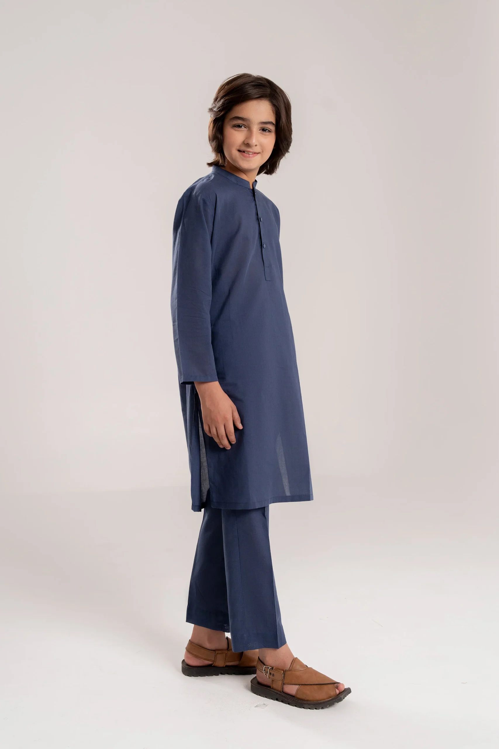 Introduce timeless cultural style to his wardrobe with this elegant Boy’s Navy Blue Kurta Shalwar Suit. Perfect for special occasions like family gatherings, Eid celebrations, and weddings, this Two-Piece Traditional Ethnic Outfit offers a dignified and sharp appearance. Crafted from a soft, comfortable fabric (assumed) with a classic band collar, this suit ensures a comfortable fit for long wear while maintaining a sophisticated silhouette. This versatile Kids Blue Formal Dress is an essential purchase for showcasing traditional style with ease and confidence.